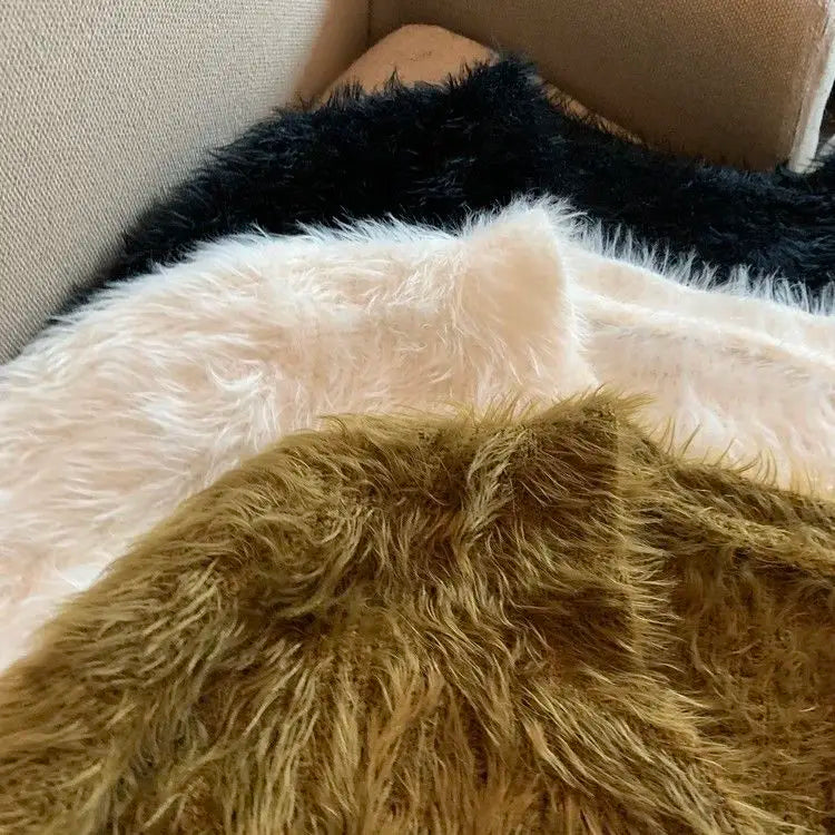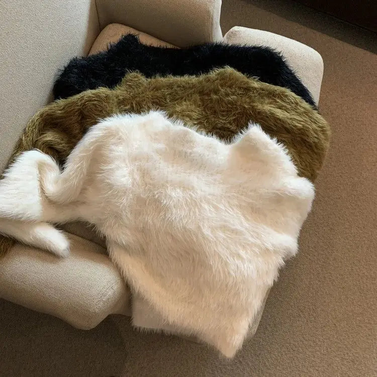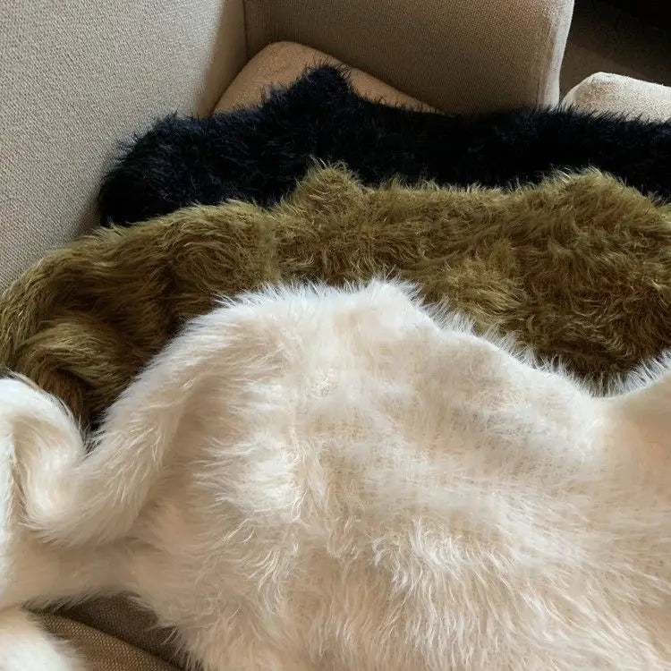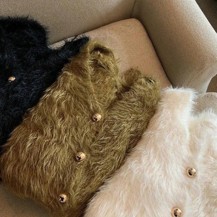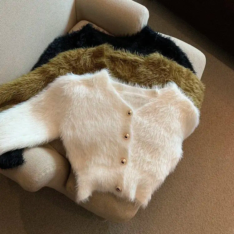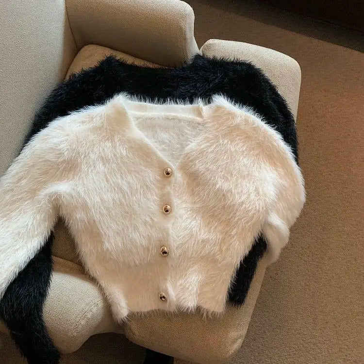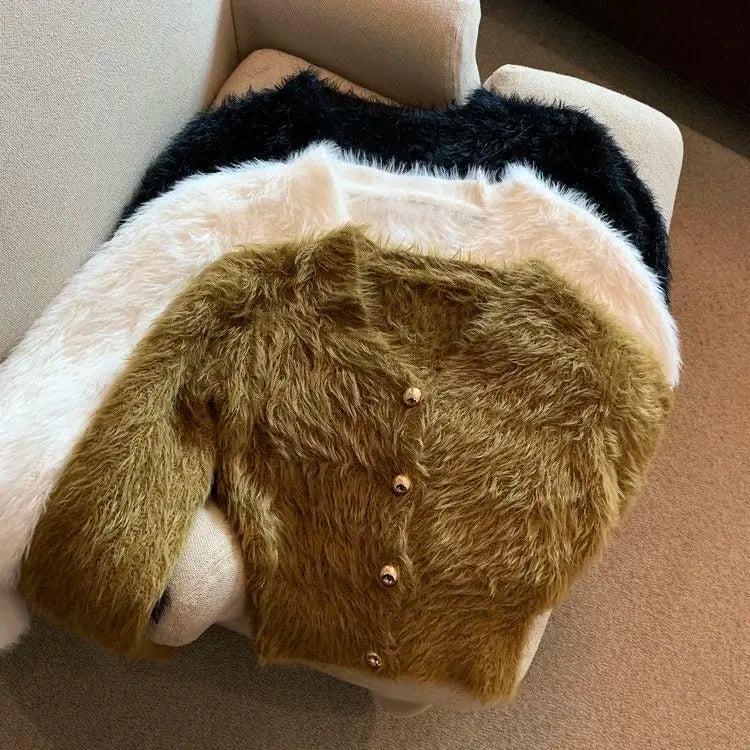 Amoura Elegance Women's V-Neck Cropped Mohair Cardigan – Retro Casual Oversized Knitted Sweater Jacket